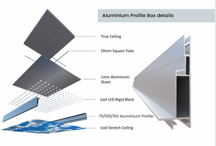 The boxing provides structural support and stability for the stretch ceiling material It helps to evenly distribute tension and weight across the ceiling surface, preventing sagging or distortion over time.